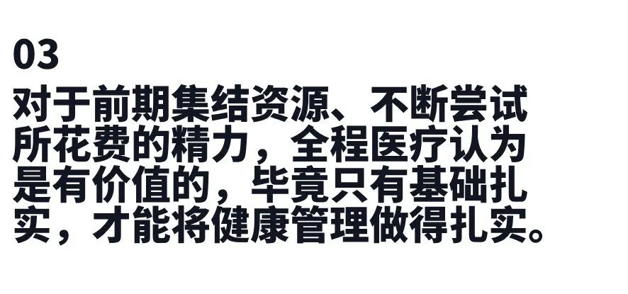 “1+N”的医疗团队、全方位的服务内容、线上线下联合的管理模式……全程医疗推出的健康管理服务,确实有值得期待的地方。首先是全科且专业的医疗团队。在慢病的健康管理包中,全程医疗会邀请专科领域内的权威名医,与全科医生、健康管理师、国际注册营养师等多位学科专家,组成一支慢病管理团队。比如这次推出的糖尿病管理包中,医疗团队中的两位名医都是糖尿病专科领域内的权威名医,有着25到30年的糖尿病治疗经验。然后是定制化的解决方案。全程医疗丰富的医疗资源,决定了它能根据客人的需求,提出最适合客人的解决方案。比如,在睡眠呼吸管理项目中,全程医疗会先为客人提供监测服务,并请专家进行报告解读,然后根据客人的解读情况提供不同的诊治方案:如果客人是呼吸问题,全程医疗会将客人对接给睡眠呼吸专家;如果客人是心理问题,就会将客人对接给心理专家。最后是精细化的服务内容。这一点在慢病健康管理包中尤其明显,进行定制化的体检后,会有名医为你门诊,帮你制定专属的慢病健康管理计划;当你为如何控制饮食而苦恼时,会有专业营养师进行指导;此外,健康管家团队还有“移动医疗”服务,让医疗团队上门提供专项服务。健康管理像只筛子,筛眼越密,就能将越多疾病筛在门外,而这些筛眼,都要靠精细的服务内容来实现。在慢病健康管理包中,还有“1+N”多对一专属健康管理微信群,能让客人随时与医疗团队进行沟通,客人提出问题,全科医生会在第一时间为客人解答。人们对健康的认知习惯正在发生改变,健康管理也逐渐成为大家开始关注的问题,如何为客人提供更系统、全面、精细的健康管理服务?全程医疗仍在努力探索。